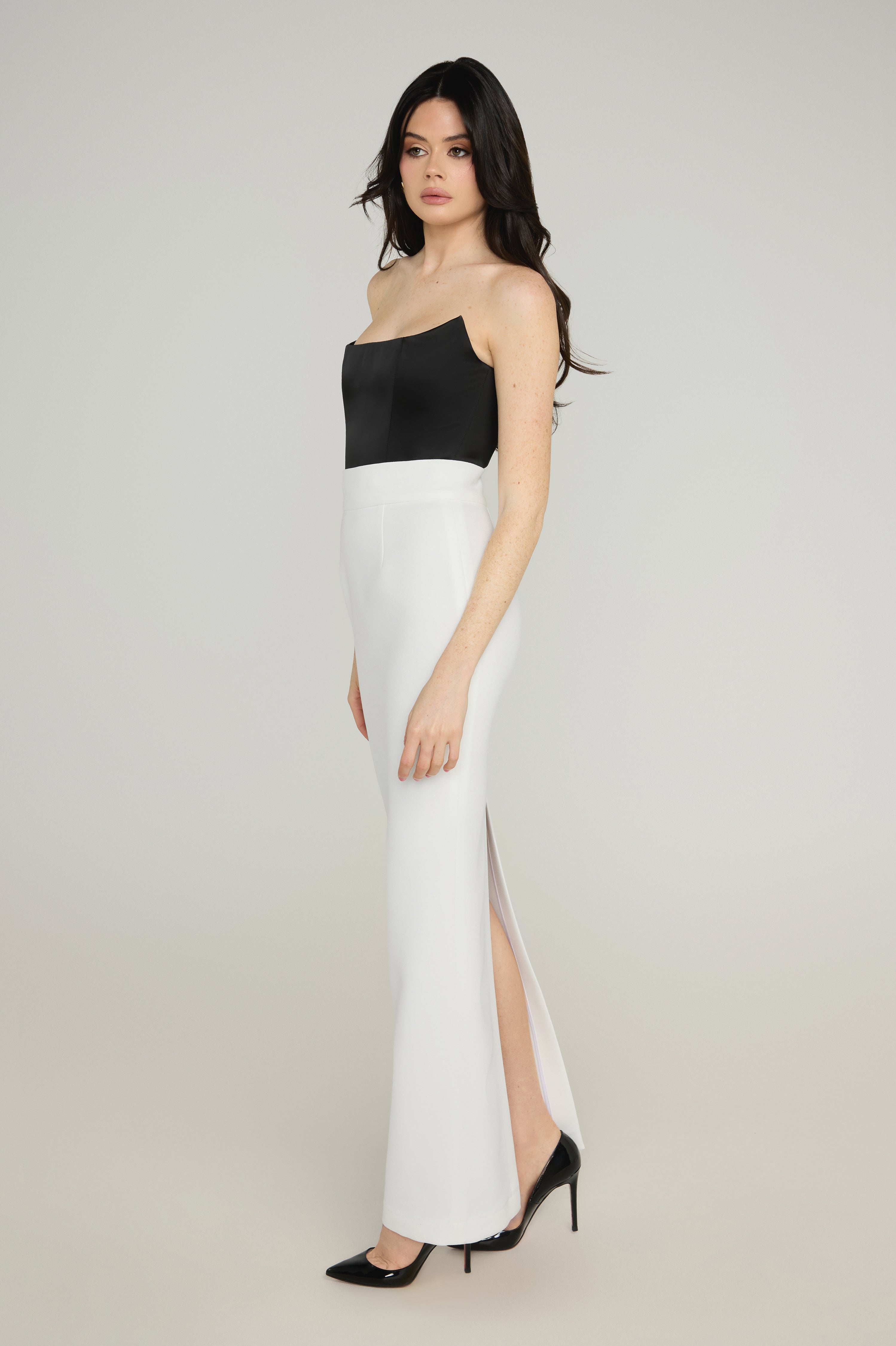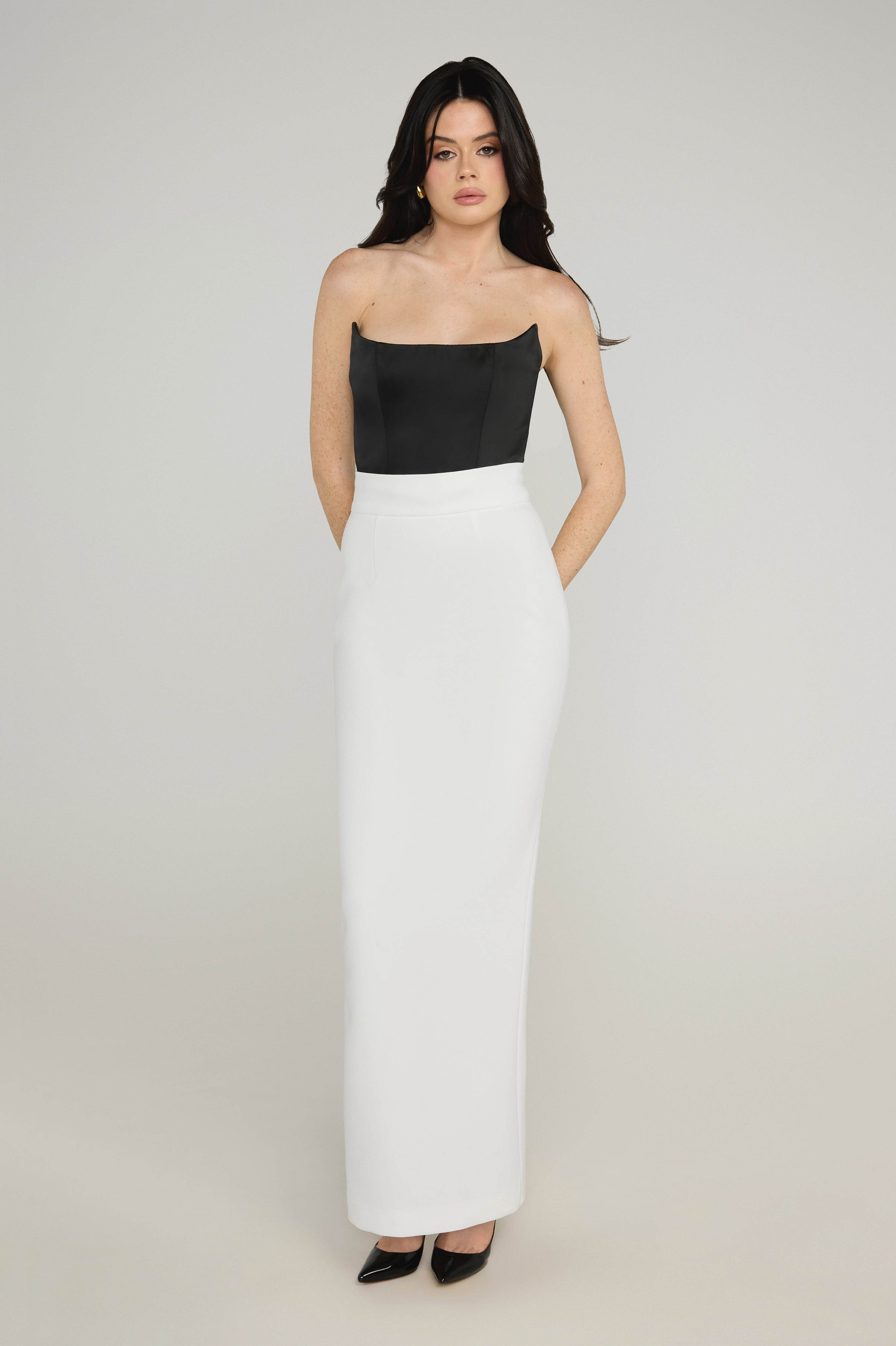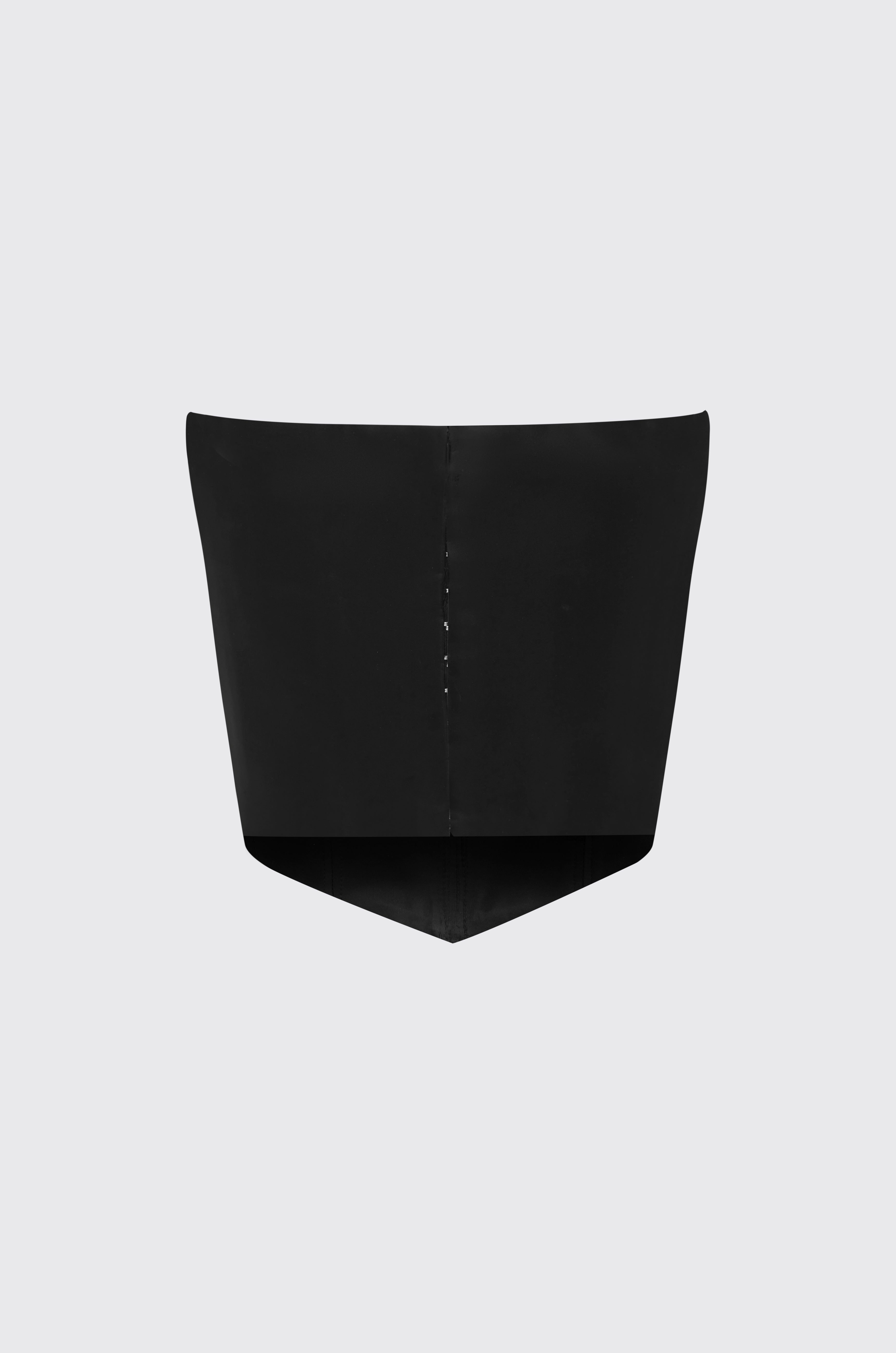 Cut from lustrous satin, this cropped bustier is structured to sculpt and define. Featuring precision internal boning and a centre-back fastening, it offers a supportive, contoured fit that enhances the silhouette. The strapless design and cropped length lend themselves to endless styling possibilities — pair it with high-waisted skirts or tailored pants for a refined day look, or layer it under sharp tailoring for elevated evening dressing.