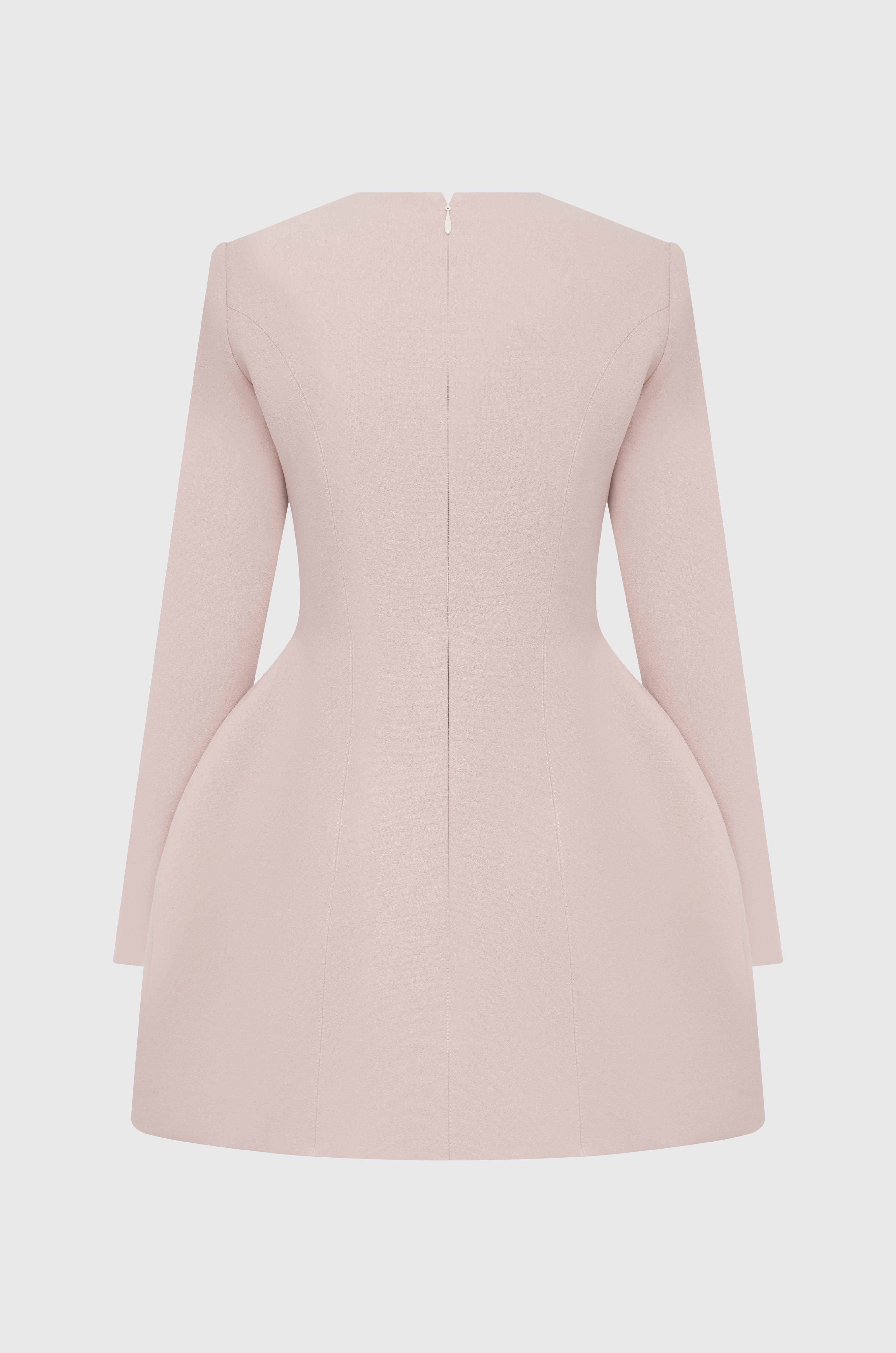 The Elle Dress is a panelled and hour glass shaped short dress, with tailored long sleeves. Made from thick crepe with side and back boning for structure.