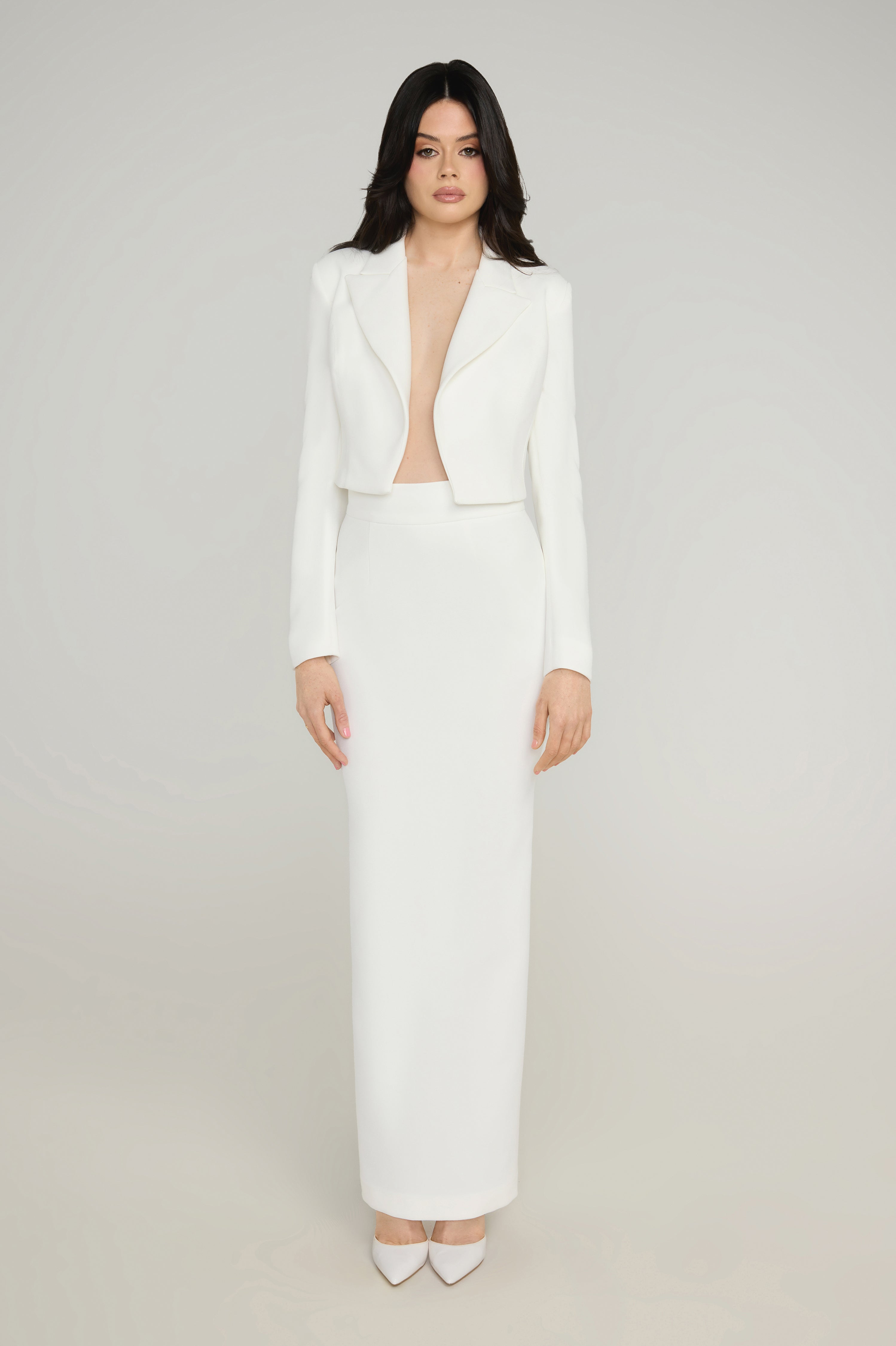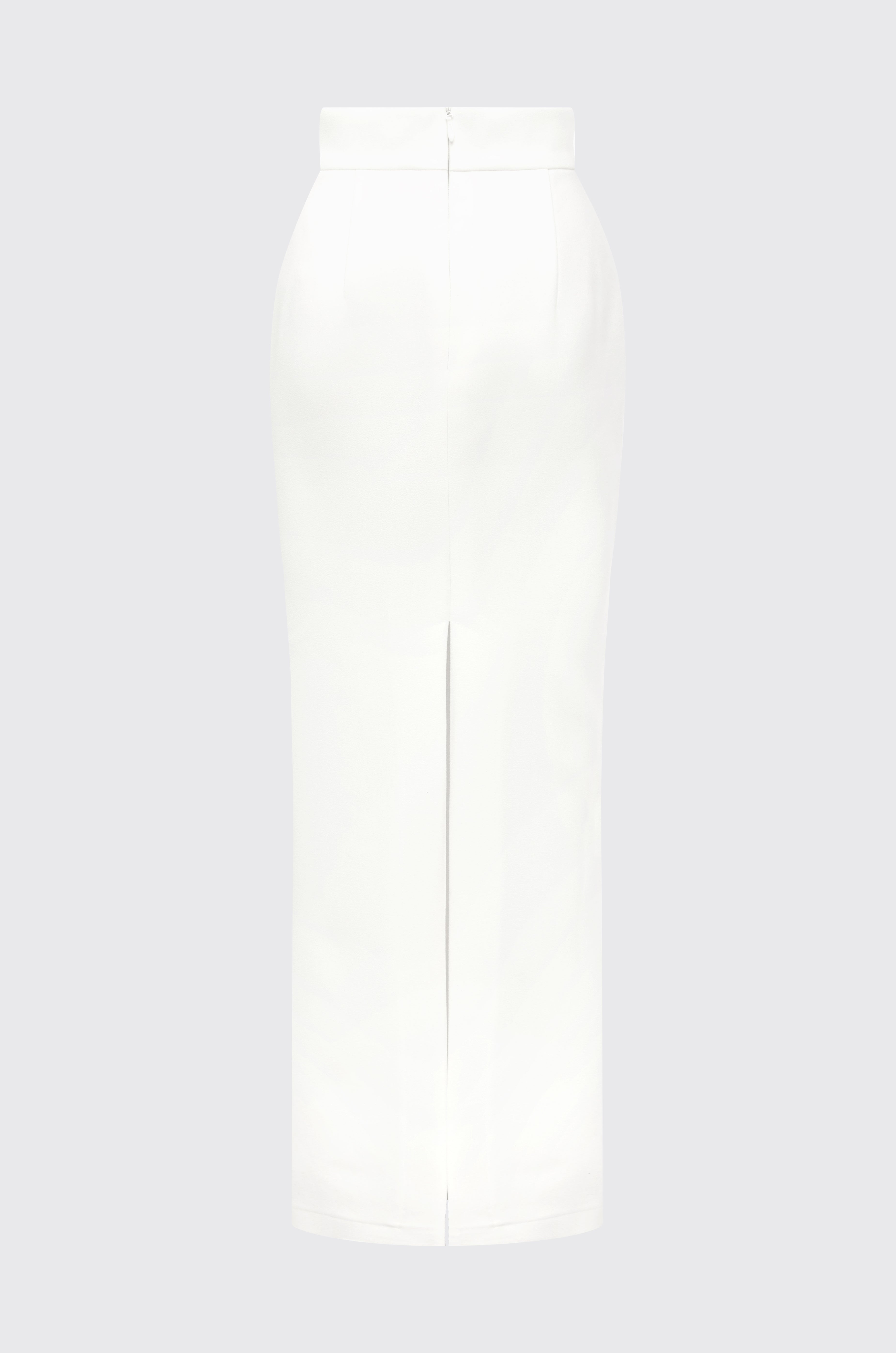A refined high-waisted pencil skirt cut to an elegant ankle length. Designed with a concealed centre-back zipper and discreet back split for ease of movement, it sculpts the waist and flatters the silhouette with timeless sophistication.