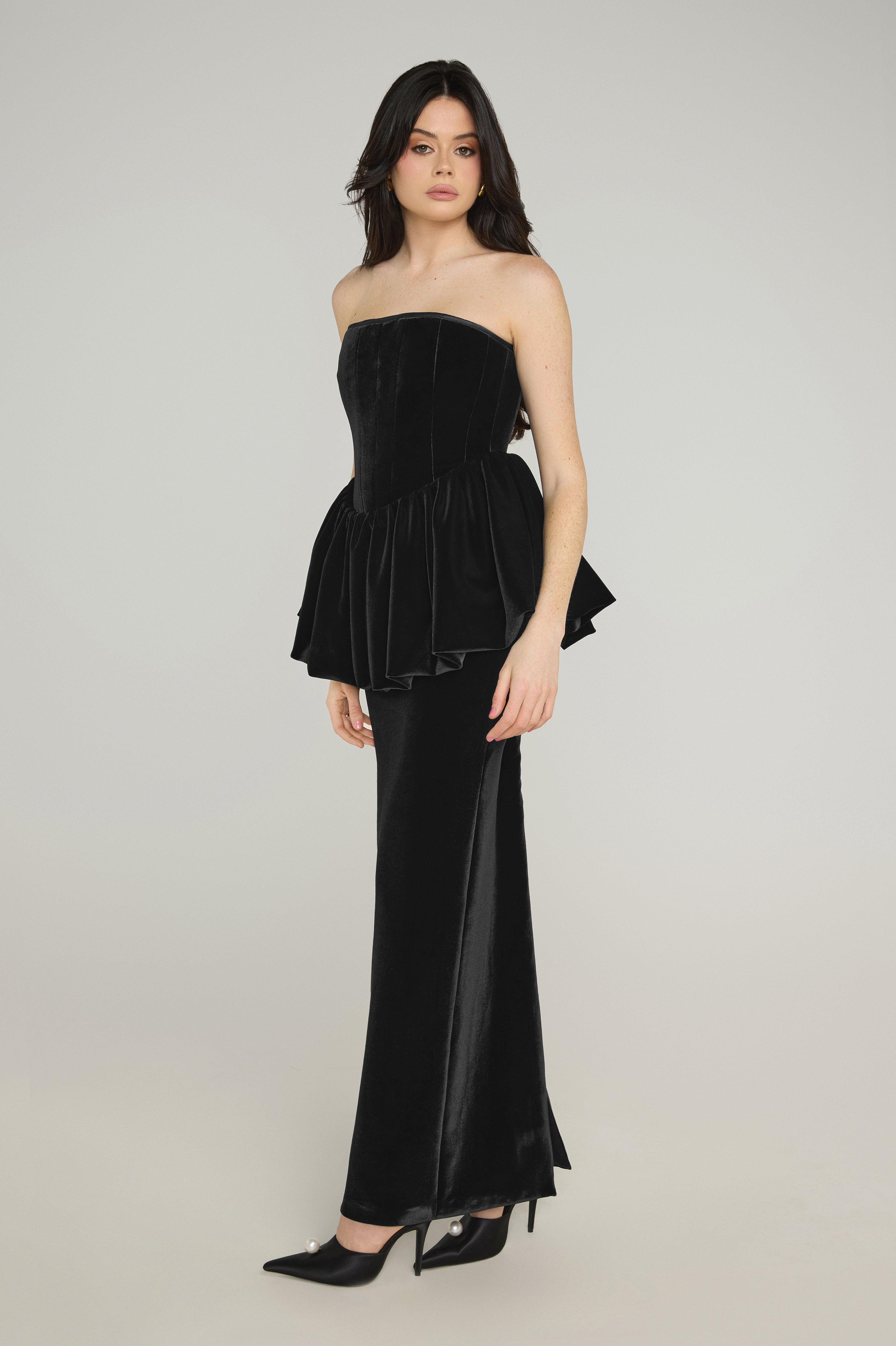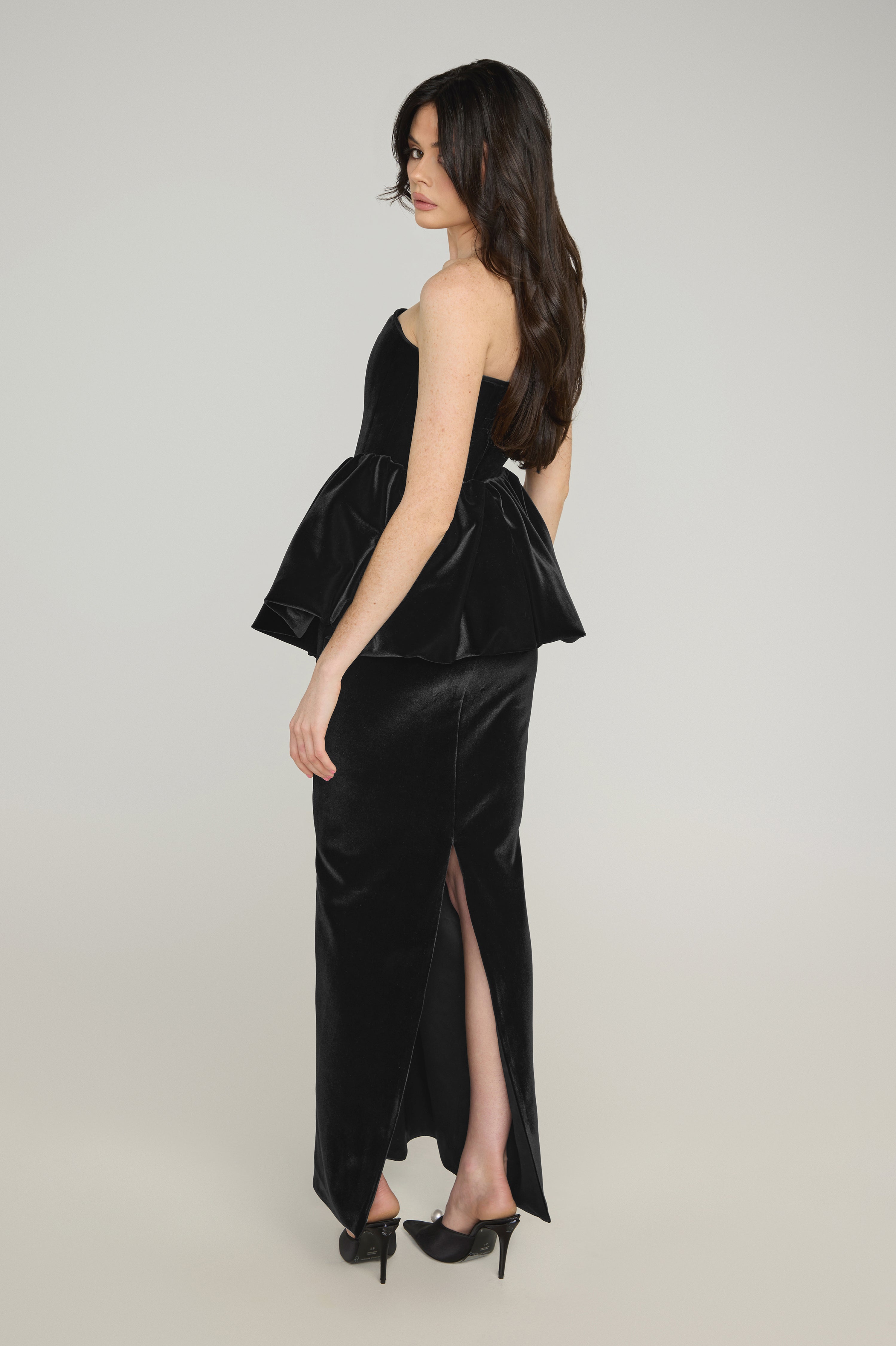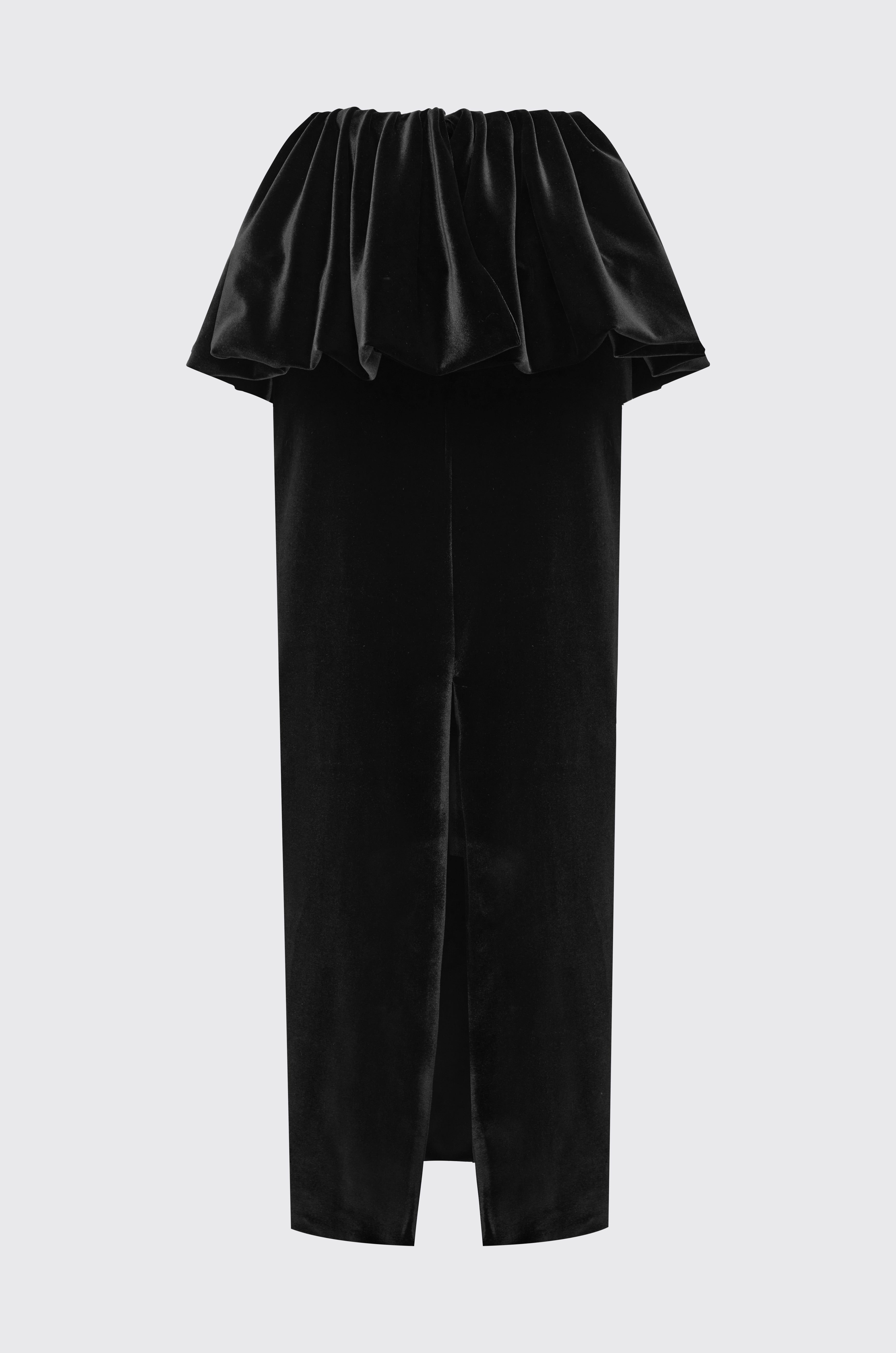 High-waisted, floor-length skirt crafted in luxurious velvet. Features internal corsetry for structure and support, with a softly gathered, bubble-style outer skirt for sculptural volume and elegant movement.