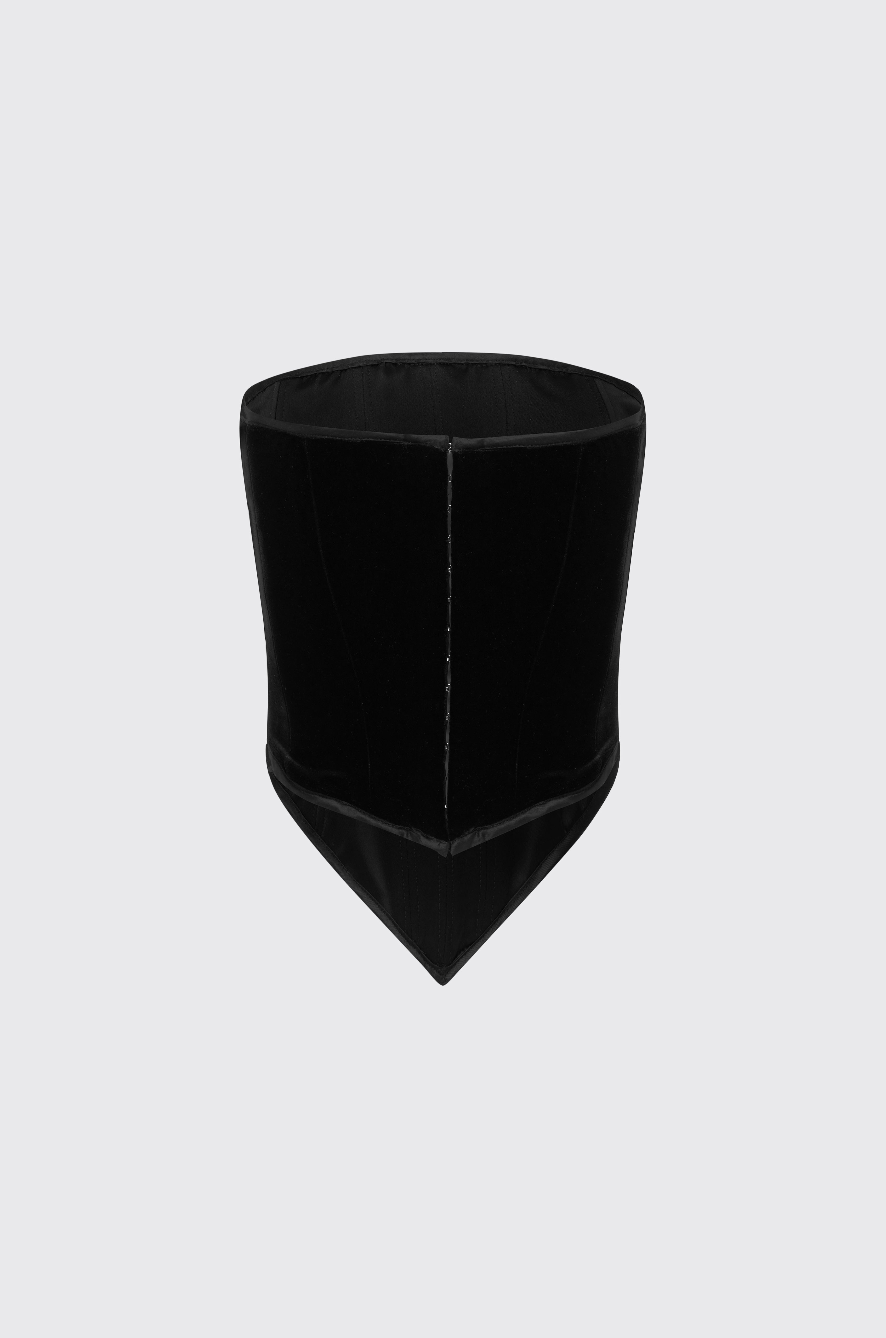 A sculpted wardrobe staple designed to transition from day to evening. This strapless bustier is expertly panelled and crafted from luxurious black velvet, finished with satin-bonded trimming for a refined contrast. The structured silhouette is secured with a centre-back hook-and-eye fastening, offering a perfect blend of support and sophistication. Style it with denim or a Dublin mini skirt for an elevated daytime look, or pair it with tailored pieces for a striking evening ensemble.
